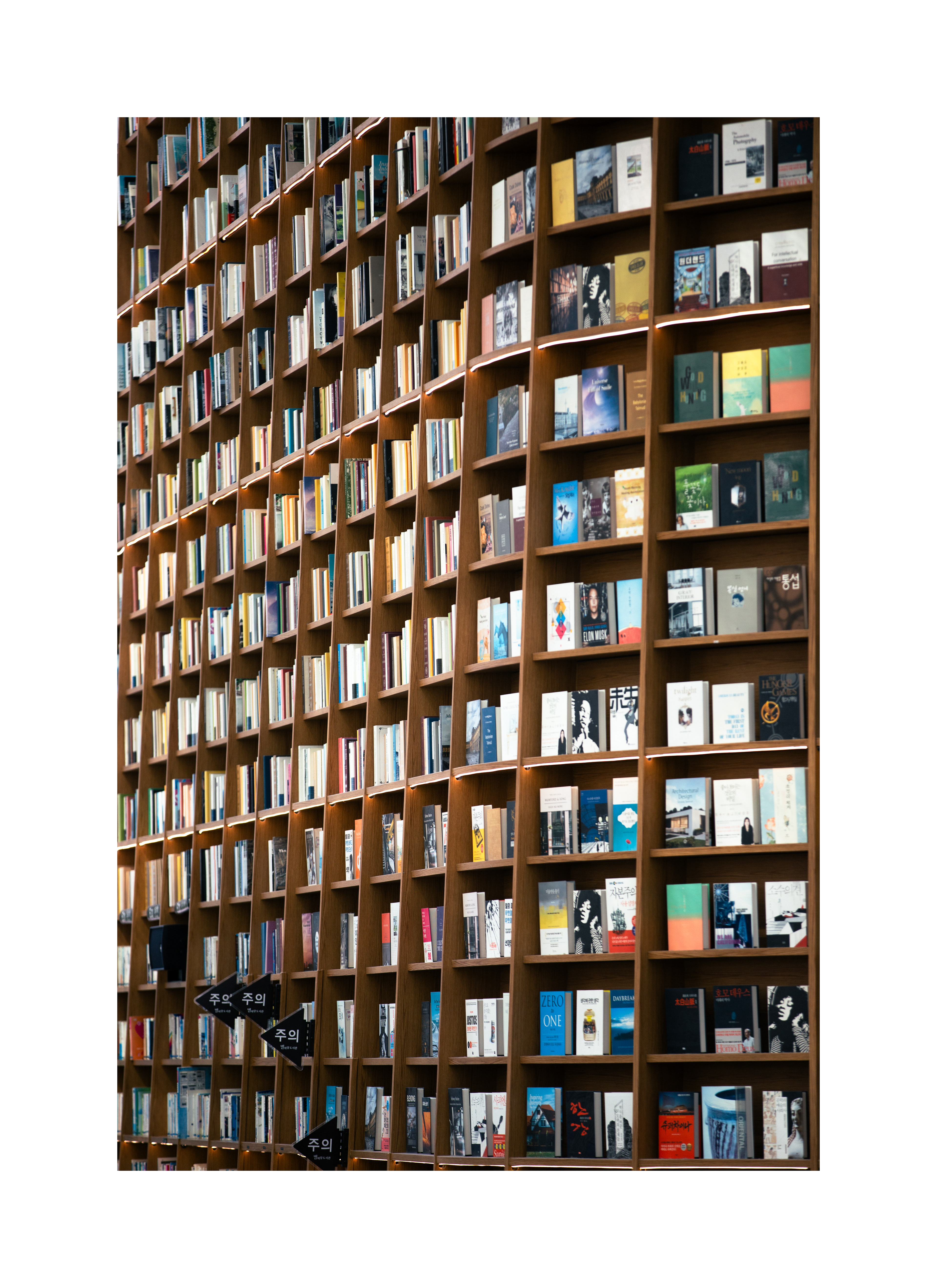La bibliothèque s’étend sur deux niveaux dans une grande atrium d’environ 2 800 m², et elle est dominée par des étagères de livres de plus de 13 m de haut qui vont du sol au plafond — un spectacle visuel unique.
